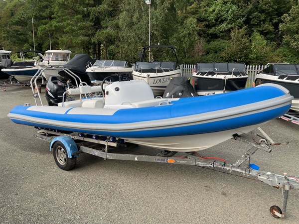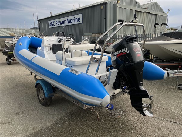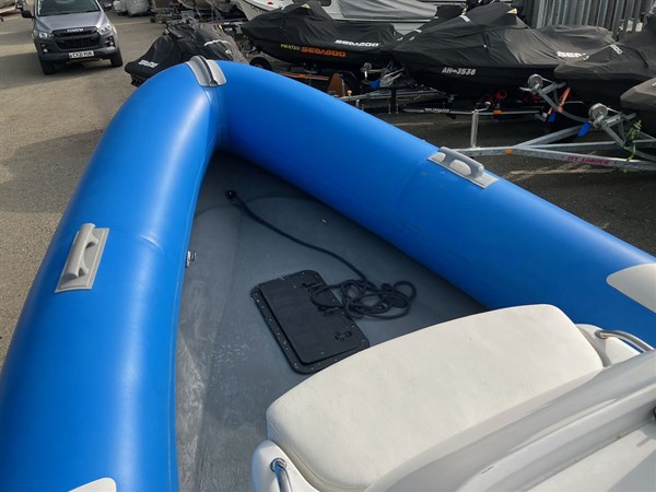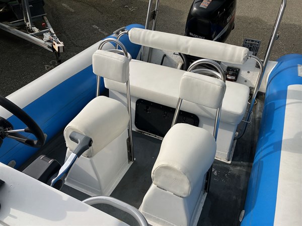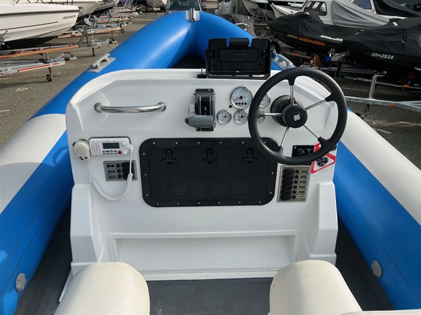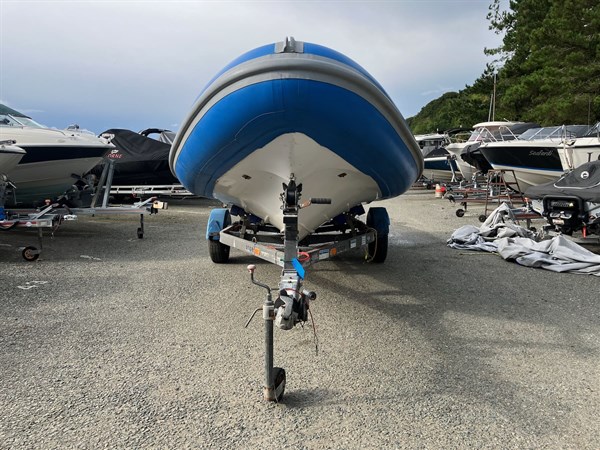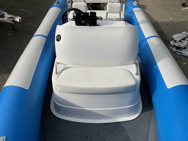 Built in 2007 by BWM. White GRP hull; blue tubes; white GRP console and seat pods. Stainless steel A-frame.