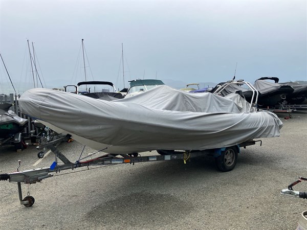 Grab handles on tubes; switch panel; bilge pump; A-frame with navigation lights & work lights; auxiliary engine bracket on transom; winter cover.