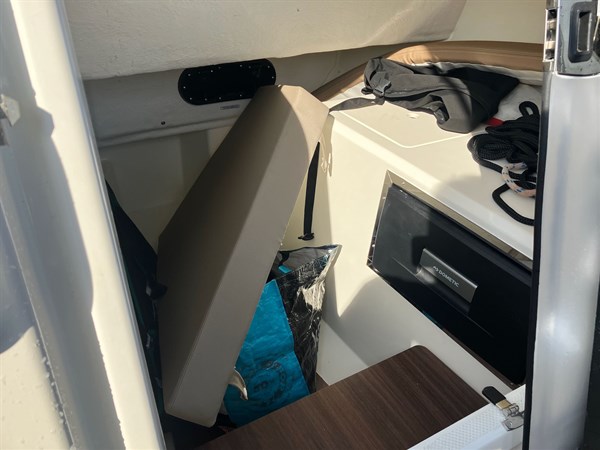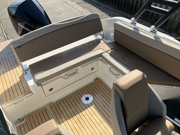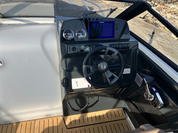 Bow Roller, Swim Ladder, Navigation Lights, Forward Anchor Locker, Self Bailing Cockpit, Swim Platform, Motor Well Bridge, Smart Craft Speedometer/Tachometer, Active Trim, Pilot Seat with Flip Bolster and Swivel, Co-Pilot Seat, Cockpit table, Cockpit Cushions, Aft Bench Seat, After Seat folding Backrest, Single Battery System, Electric & Manual Bilge Pump, Hydraulic Steering, Starboard Windscreen Wiper, Fire Extinguisher, CO Monitor, Vessel View Mobile, Cabin Lights, Opening Portlights, Bow Cushions