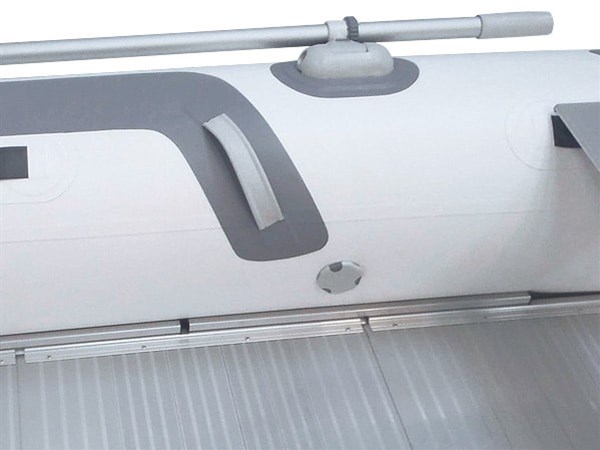 Lifting eyes; towing ring; internally-operated bailer; removable thwart seat; bow handle; carrying handles; reinforced cone ends fishtails; aluminum oars; foot pump; repair kit; owner’s manual; transport bag.